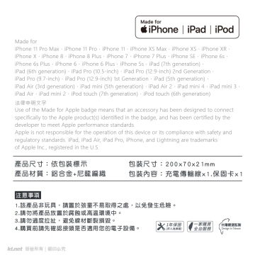 • ◆為蘋果MFI認證線,相容全系列 iPhone / iPad / iPod 商品